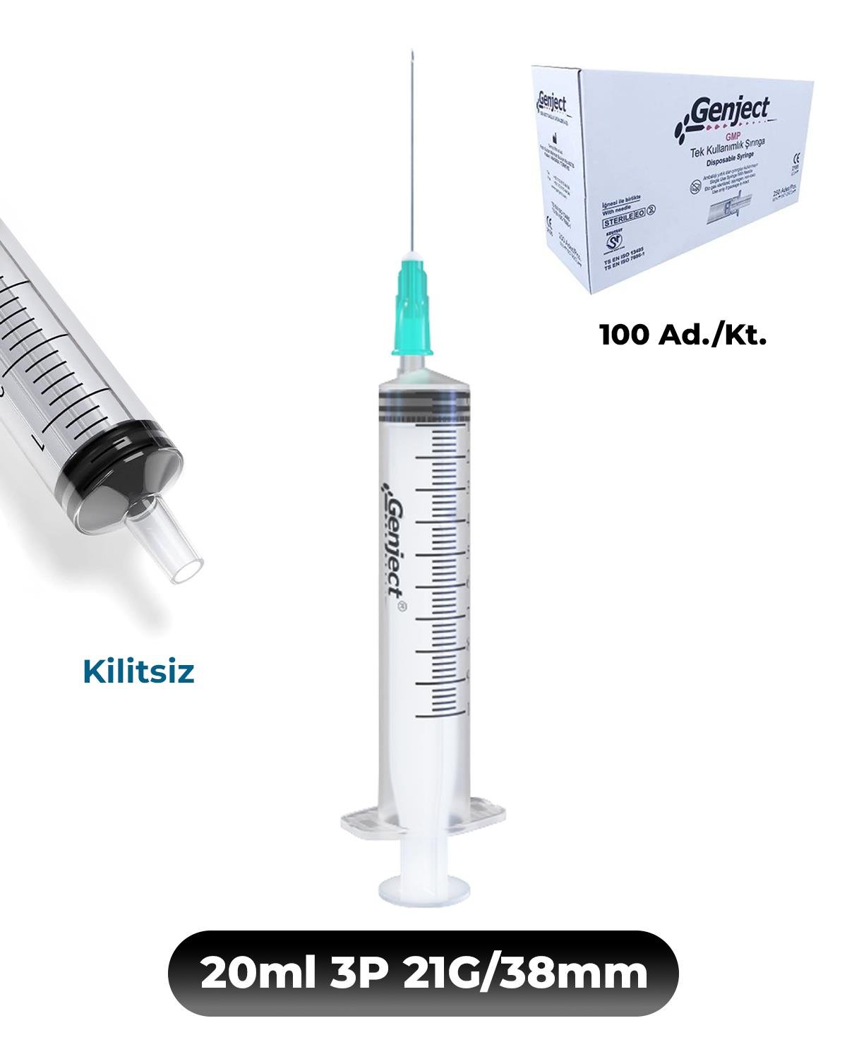 Genject 20 ml. , 3 Parçalı , 21G (0.82mm.), 38mm,Yeşil İğneli Şırınga, Enjektör 100 Ad./Kt.