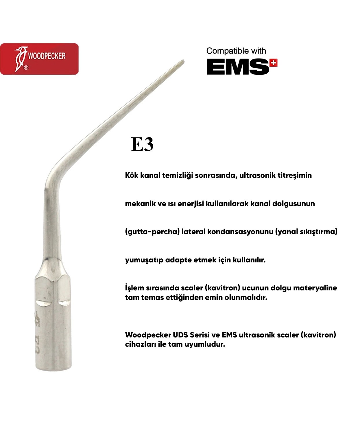 E3 kavitron ucu, kök kanal temizliği ve şekillendirmesi tamamlandıktan sonraki en kritik aşama için tasarlanmıştır.